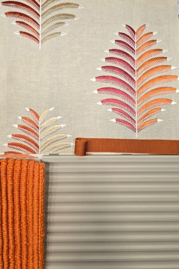 На окно сошьём римскую штору с веерами волшебных листьев и отделкой терракотовой тесьмой